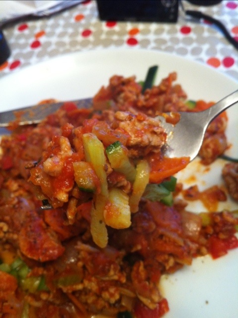 - A dish that I’m calling “Chock-full-of-veggies Spaghetti,” or a tomato and ground pork sauce with carrots, onions, celery, garlic, and red pepper over one thinly sliced boiled zucchini.